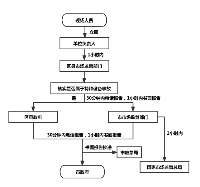 對(duì)于發(fā)生特種設(shè)備事故的,有關(guān)區(qū)縣政府、市市場(chǎng)監(jiān)管部門要在接到報(bào)告后30分鐘內(nèi)電話、1小時(shí)內(nèi)書面向市政府報(bào)告,書面報(bào)告同時(shí)抄送市應(yīng)急局。市市場(chǎng)監(jiān)管局應(yīng)于2小時(shí)內(nèi)報(bào)告國家市場(chǎng)監(jiān)管總局。